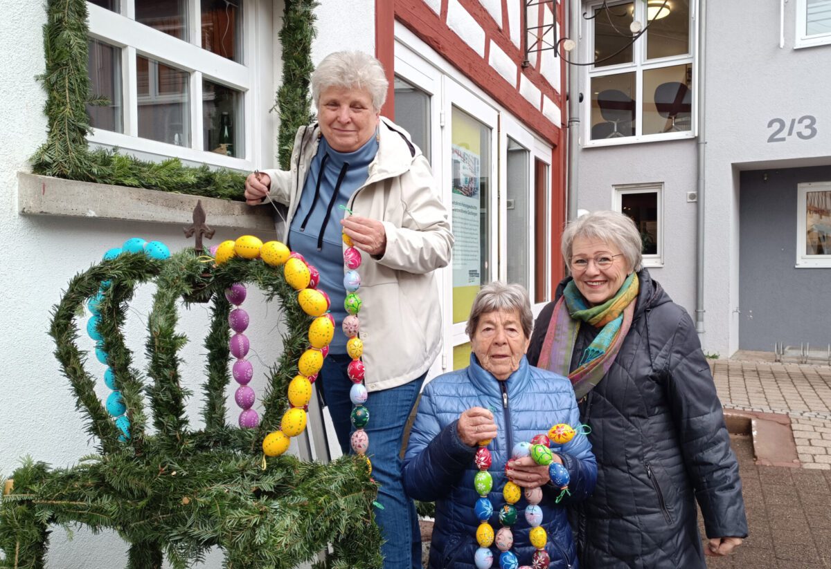 Nach Beendigung des mehrtägigen Großputzes im Heimatmuseum Appeleshof in Gechingen, hat das Team freiwilliger Helferinnen und Helfer wieder den „Osterbrunnen“ für Sie vorbereitet. In Anlehnung an einen aus der fränkischen Schweiz stammenden Brauch wurde der Steinbrunnen im Hof mit Girlanden aus natürlichem Grün und mit ausgeblasenen und handbemalten Ostereiern dekoriert.